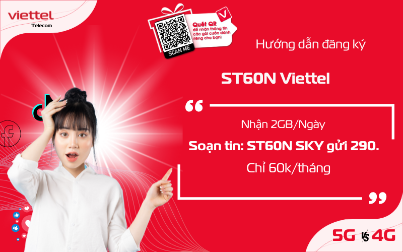 Trong thời đại công nghệ phát triển mạnh mẽ, việc sở hữu một gói cước 4G giá rẻ nhưng vẫn đáp ứng tốt nhu cầu sử dụng internet là điều mà bất kỳ người dùng Viettel nào cũng mong muốn. Với mức giá chỉ 60.000 đồng/tháng, gói cước ST60N Viettel mang đến cho bạn 60GB data tốc độ cao (2GB/ngày) trong suốt 30 ngày. Đây là lựa chọn lý tưởng để bạn lướt web, xem video, chơi game hay làm việc từ xa mà không lo tốn kém. Trong bài viết này, chúng tôi sẽ hướng dẫn bạn từng bước cách đăng ký 4G Viettel 60K 1 tháng, đặc biệt là gói ST60N, cùng với các thông tin quan trọng khác để bạn sử dụng gói cước hiệu quả nhất. Hãy cùng khám phá ngay nhé!