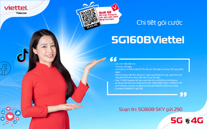 Trong thời đại công nghệ phát triển vượt bậc, nhu cầu sử dụng internet tốc độ cao và liên lạc không giới hạn ngày càng trở nên quan trọng đối với mọi người. Để đáp ứng điều đó, Viettel – nhà mạng hàng đầu tại Việt Nam – đã ra mắt gói 5G160B Viettel, một gói cước siêu hấp dẫn dành cho các thuê bao di động Viettel hiện tại. Với mức giá chỉ 160.000đ/tháng, gói cước này mang đến 120GB data tốc độ cao, miễn phí 10 phút đầu các cuộc gọi nội mạng, 100 phút gọi ngoại mạng, cùng các tiện ích bổ sung như TV360 Basic 4K và 20GB lưu trữ Mybox. Đây chắc chắn là một trong những gói cước Viettel giá rẻ đáng cân nhắc nhất hiện nay.