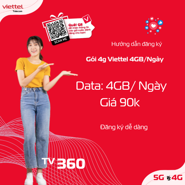 Chào bạn! Tôi là một người dùng Viettel lâu năm, thường xuyên tìm kiếm các gói cước phù hợp để kết nối internet mọi lúc mọi nơi. Hôm nay, tôi viết bài này dành riêng cho những ai đang cần một giải pháp internet tốc độ cao, dung lượng lớn mà không làm "đau ví". Nếu bạn là học sinh, sinh viên cần học online, nhân viên văn phòng xử lý công việc từ xa, hoặc đơn giản là người thích xem phim, lướt mạng xã hội cả ngày, thì gói 4G Viettel tháng 4GB/ngày chính là thứ bạn đang tìm kiếm! Với 4GB mỗi ngày, tương đương 120GB/tháng, gói này giúp bạn thoải mái sử dụng mà không lo hết data giữa chừng.