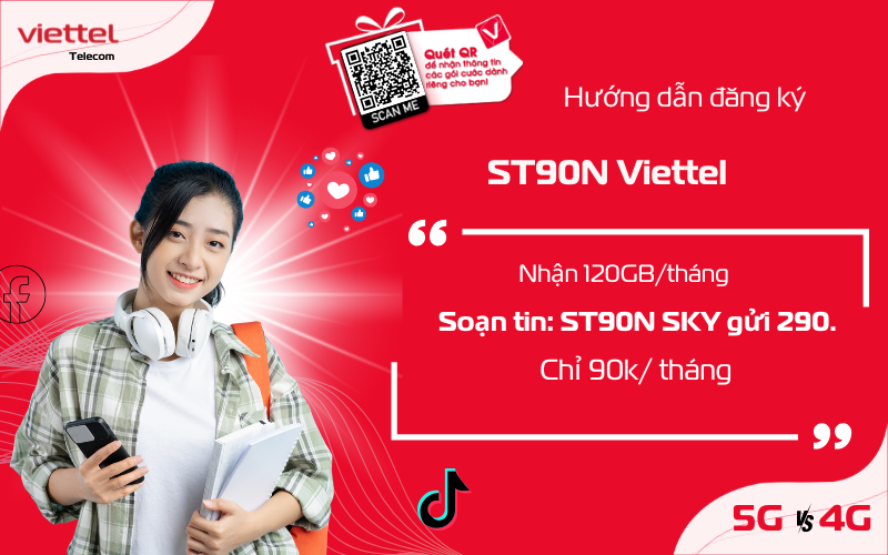 Đăng ký mạng Viettel 90k 1 tháng ngay hôm nay để nhận 120GB data cao tốc (4GB/ngày) qua gói ST90N, SD90 và nhiều gói khác. Hướng dẫn đăng ký mạng Viettel đơn giản qua SMS, app My Viettel hoặc goicuoc5g.com.vn. Tiết kiệm chi phí, phủ sóng 5G rộng rãi, phù hợp học online, làm việc từ xa. Cập nhật ưu đãi mới nhất 2025!